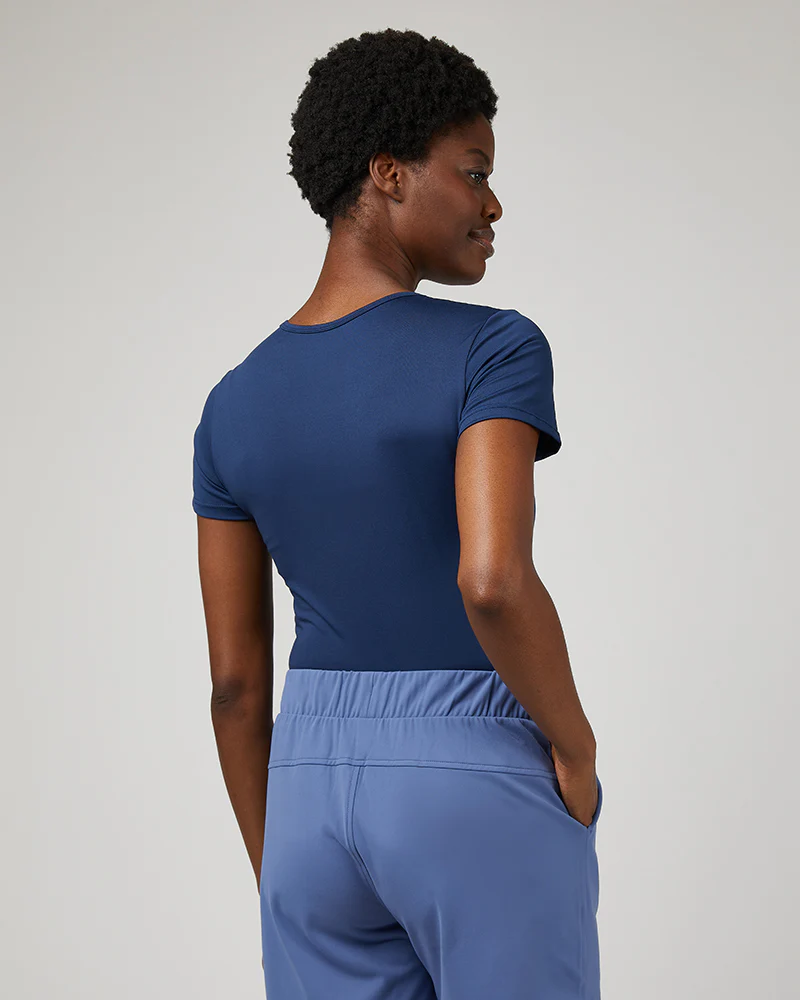 The everyday performance tee at an everyday price. Moisture-wicking 4-way stretch polyester-spandex in a fitted cut that flatters and performs. Tag-free label for all-day comfort.